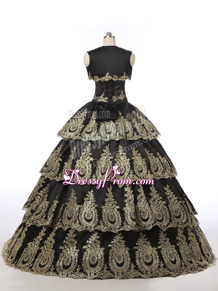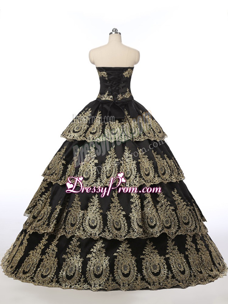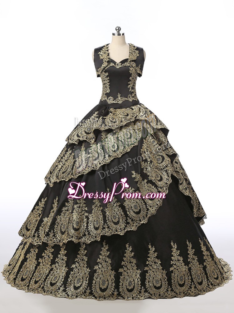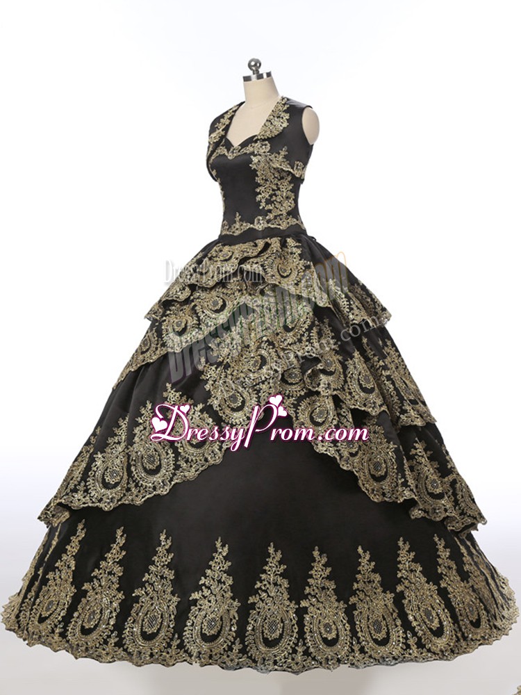 Neckline : SweetheartShown Color : BlackSilhouette : Ball GownsSleeve Length : sleevelessHemline : floor lengthBack Detail : Lace upFabric : SatinEmbellishment : EmbroideryOccasion : Military Ball,Sweet 16,QuinceaneraSeason : Spring,Summer,Fall,Winter