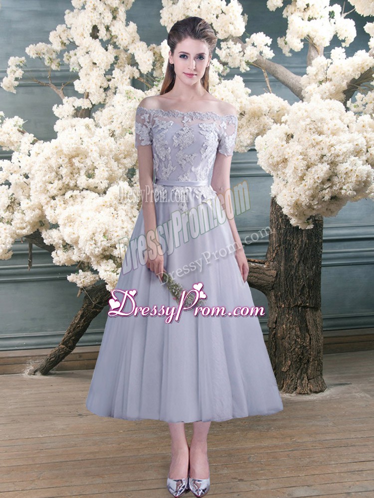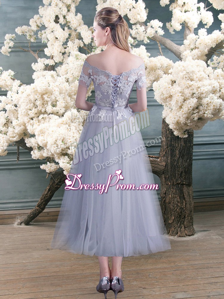 Neckline : Off the shoulderShown Color : GreySilhouette : A-lineSleeve Length : short sleevesHemline : ankle lengthBack Detail : Lace upFabric : TulleEmbellishment : Lace,AppliquesOccasion : Prom,PartySeason : Spring,Summer,Fall