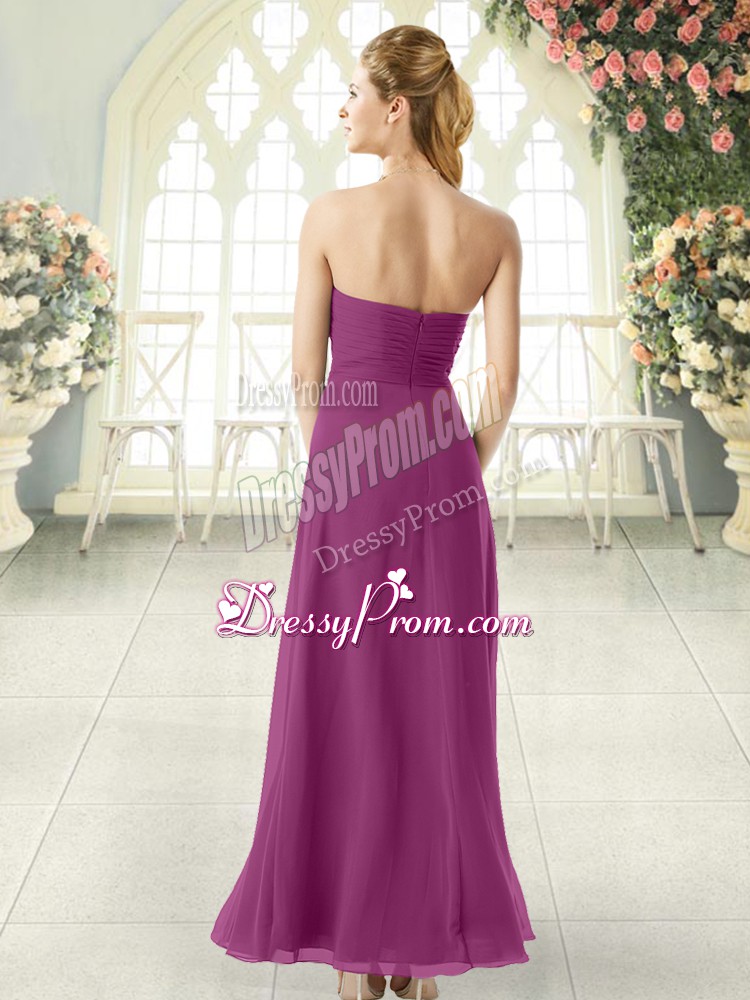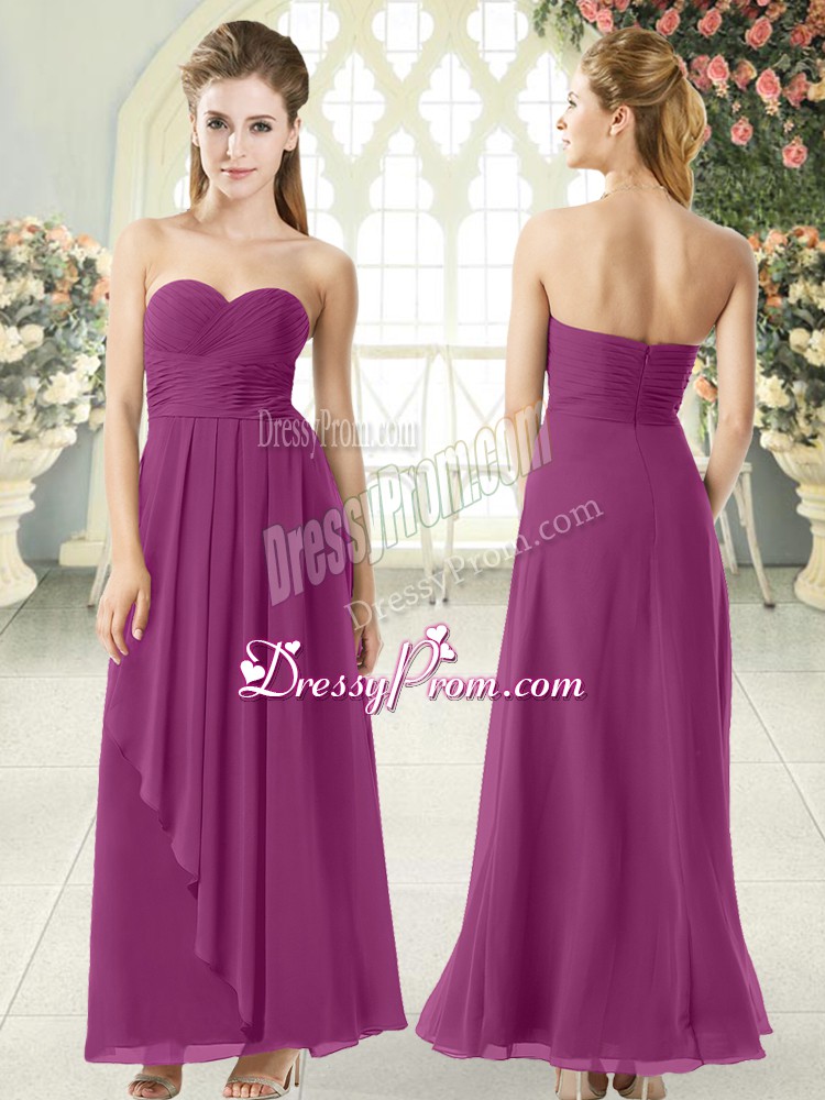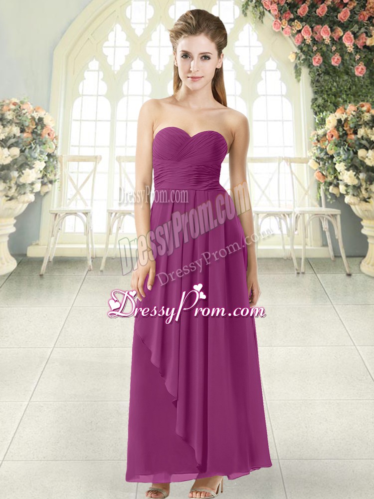 Neckline : SweetheartShown Color : PurpleSilhouette : EmpireSleeve Length : sleevelessHemline : ankle lengthBack Detail : ZipperFabric : ChiffonEmbellishment : RuchingOccasion : Prom,PartySeason : Spring,Summer,Fall,Winter