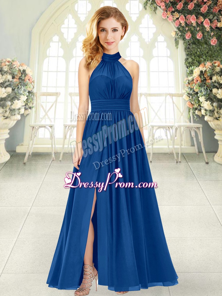 Neckline : Halter topShown Color : BlueSilhouette : EmpireSleeve Length : sleevelessHemline : ankle lengthBack Detail : ZipperFabric : ChiffonEmbellishment : RuchingOccasion : Prom,PartySeason : Spring,Summer,Fall,Winter