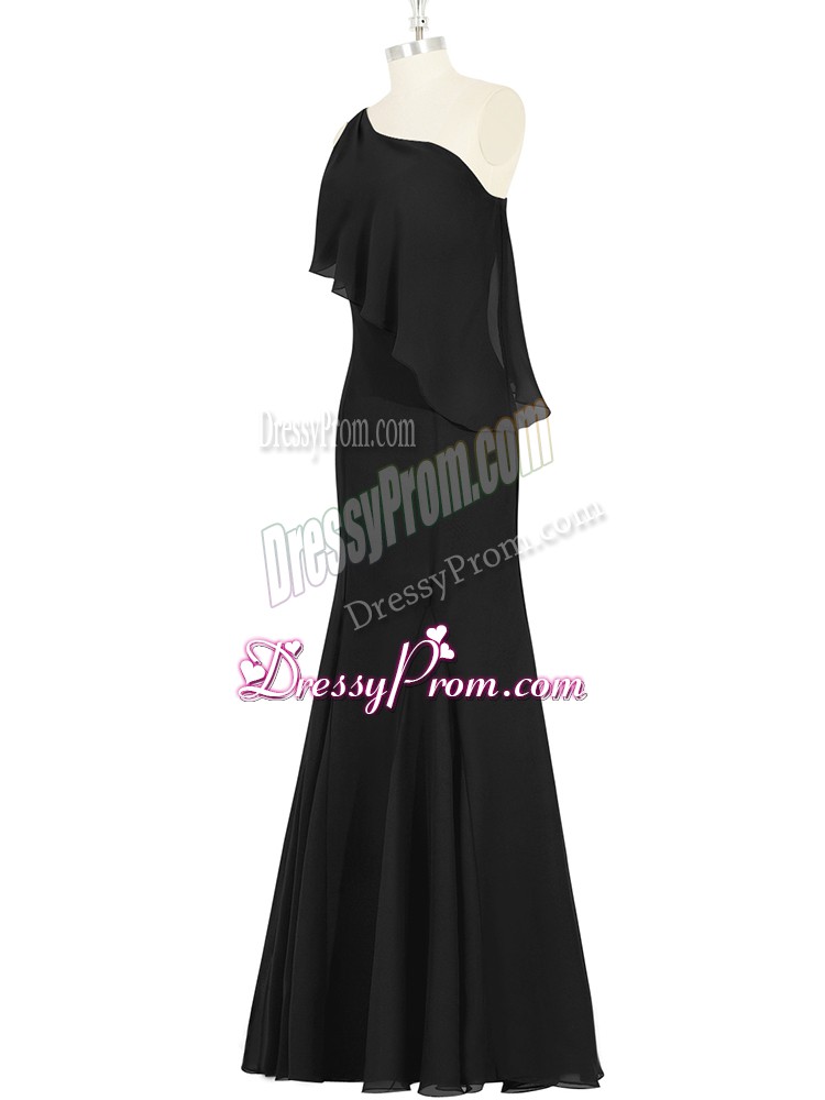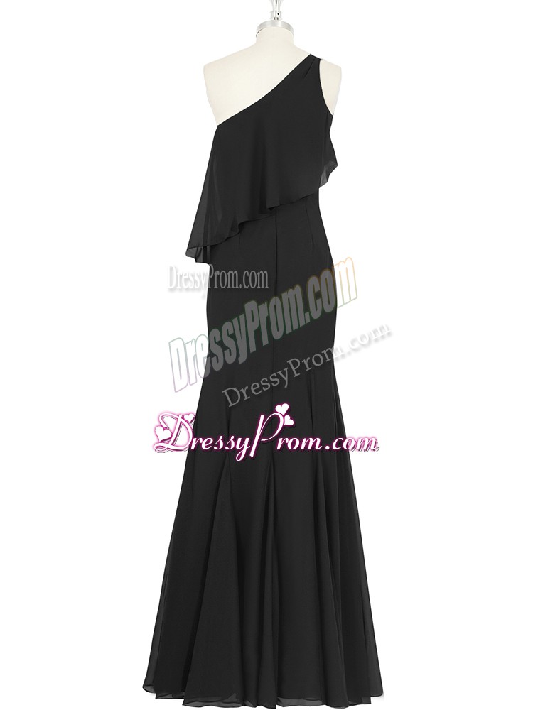 Neckline : One shoulderShown Color : BlackSilhouette : MermaidSleeve Length : sleevelessHemline : floor lengthBack Detail : Side zipperFabric : ChiffonEmbellishment : RuchingOccasion : Prom,Party,Military BallSeason : Spring,Summer,Fall,Winter