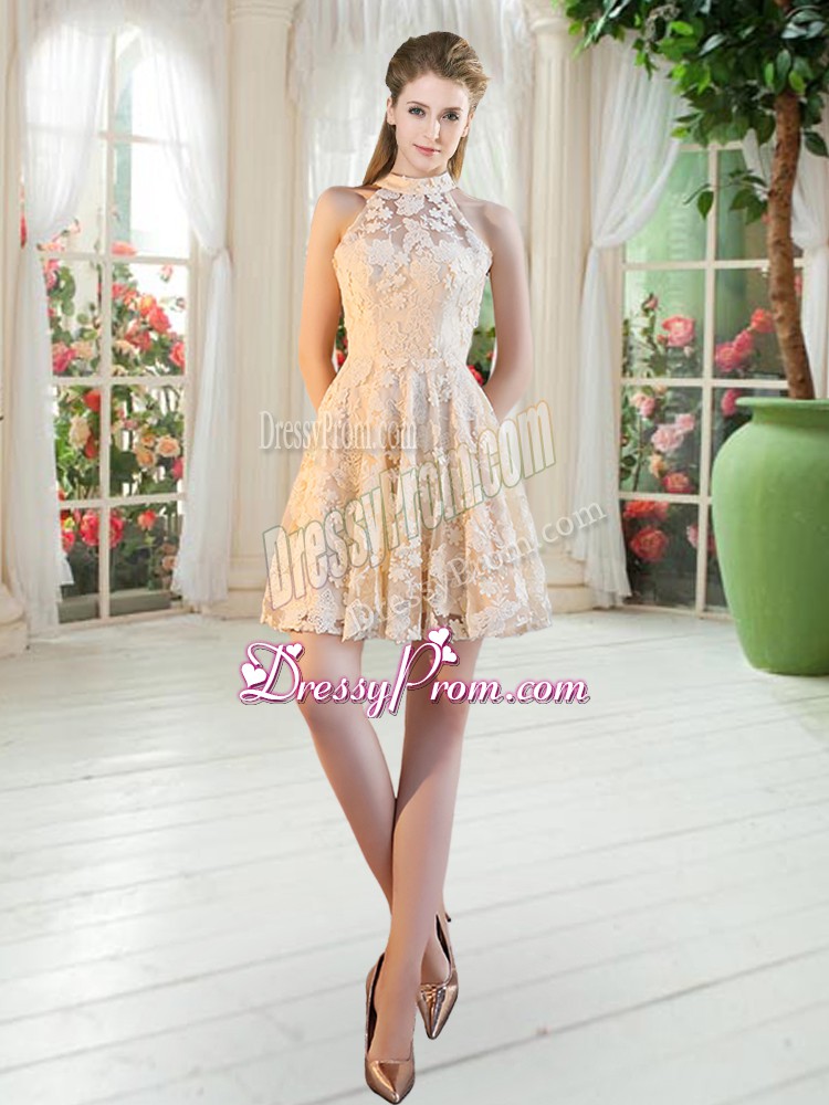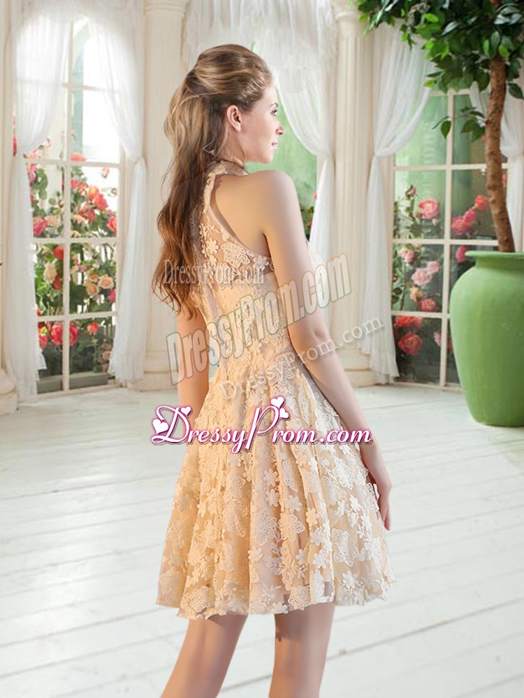 Neckline : High-neckShown Color : ChampagneSilhouette : A-lineSleeve Length : sleevelessHemline : mini lengthBack Detail : ZipperEmbellishment : LaceOccasion : Prom,PartySeason : Spring,Summer,Fall