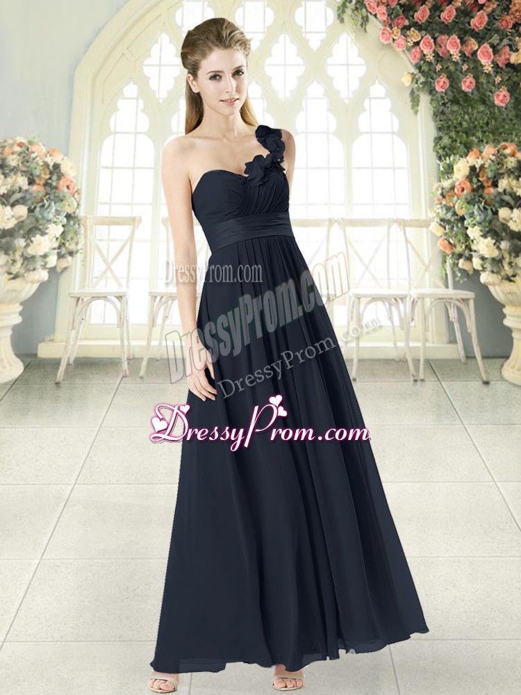 Neckline : One shoulderShown Color : BlackSilhouette : EmpireSleeve Length : sleevelessHemline : ankle lengthBack Detail : ZipperFabric : ChiffonEmbellishment : Hand Made FlowerOccasion : Prom,PartySeason : Spring,Summer,Fall,Winter
