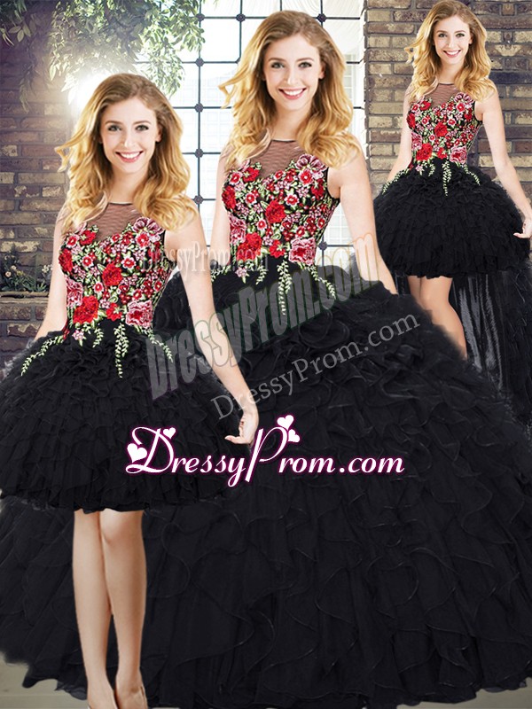 Neckline : ScoopShown Color : BlackSilhouette : Ball GownsSleeve Length : sleevelessBack Detail : ZipperFabric : OrganzaEmbellishment : Embroidery,RufflesOccasion : Military Ball,Sweet 16,QuinceaneraSeason : Spring,Summer,Fall,Winter