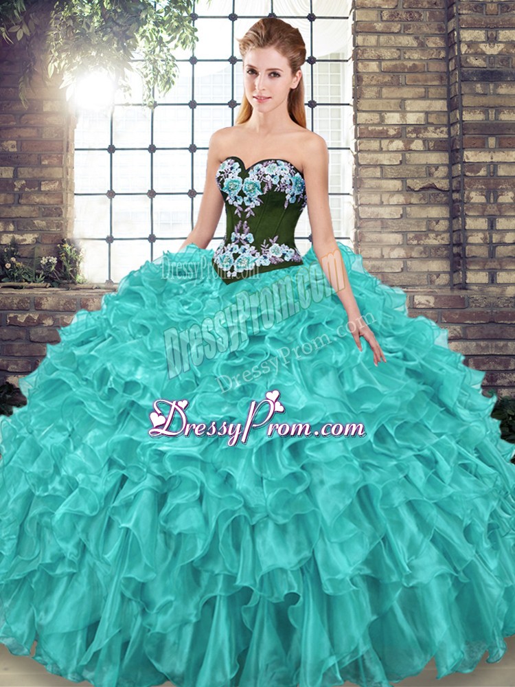 Neckline : SweetheartShown Color : TurquoiseSilhouette : Ball GownsSleeve Length : sleevelessBack Detail : Lace upFabric : OrganzaEmbellishment : Embroidery,RufflesOccasion : Military Ball,Sweet 16,QuinceaneraSeason : Spring,Summer,Fall,Winter