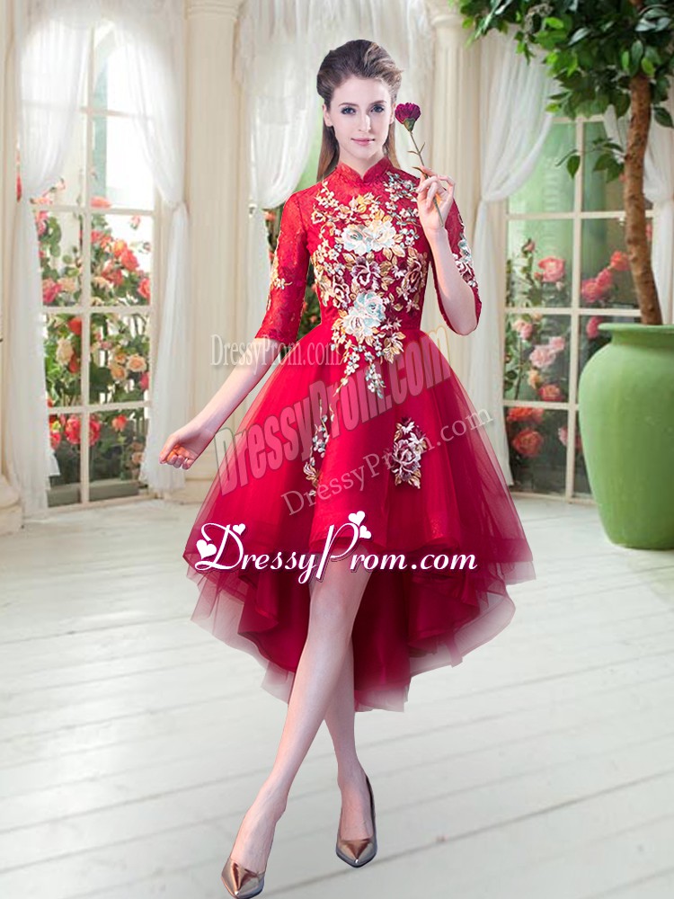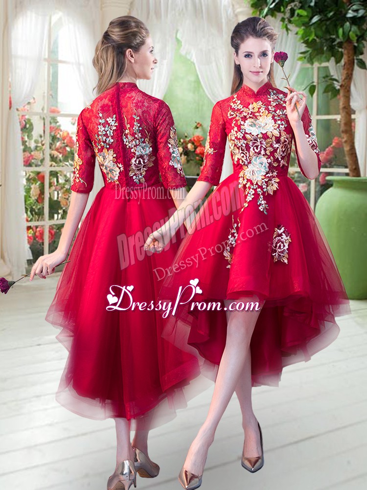 Red A-line Appliques Zipper Tulle Half Sleeves High Low