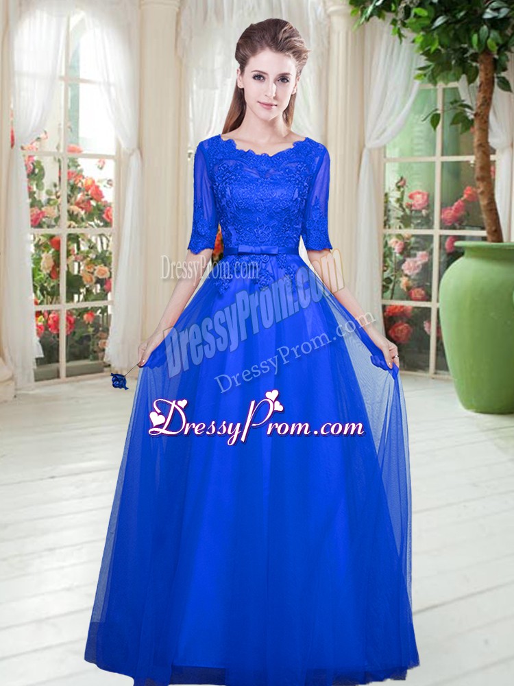 Neckline : ScoopShown Color : Royal BlueSilhouette : EmpireSleeve Length : half sleevesHemline : floor lengthBack Detail : Lace upFabric : TulleEmbellishment : LaceOccasion : Prom,PartySeason : Spring,Summer,Fall,Winter
