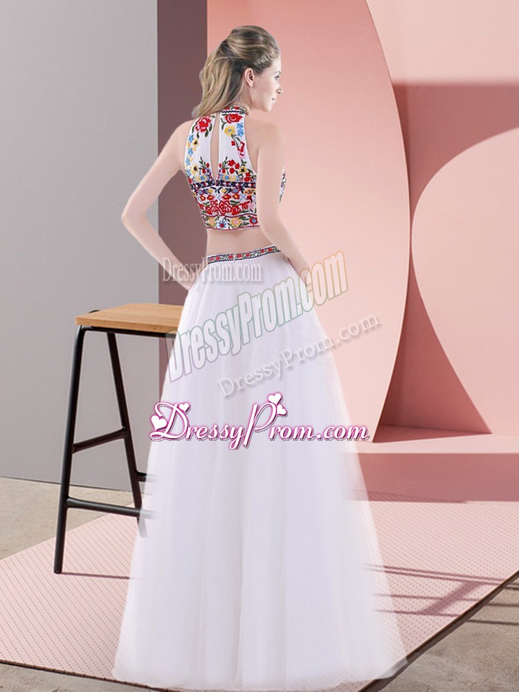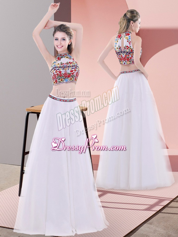 Neckline : High-neckShown Color : WhiteSilhouette : Two PiecesSleeve Length : sleevelessHemline : floor lengthBack Detail : Lace upFabric : TulleEmbellishment : EmbroideryOccasion : Prom,PartySeason : Spring,Summer,Fall,Winter