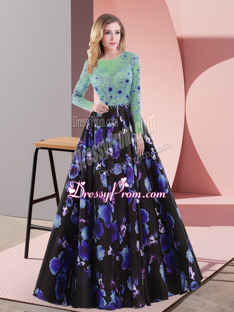 Neckline : ScoopShown Color : Multi-colorSilhouette : A-lineSleeve Length : long sleevesBack Detail : Lace upFabric : PrintedEmbellishment : AppliquesOccasion : Prom,Party,Military BallSeason : Spring,Summer,Fall,Winter