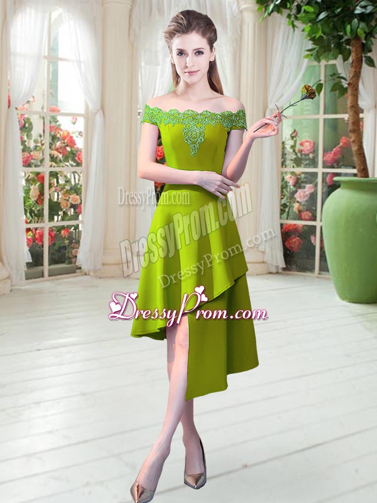 Neckline : Off the shoulderShown Color : Light YellowSilhouette : A-lineSleeve Length : sleevelessHemline : asymmetricalBack Detail : ZipperFabric : SatinEmbellishment : AppliquesOccasion : Prom,PartySeason : Spring,Summer,Fall