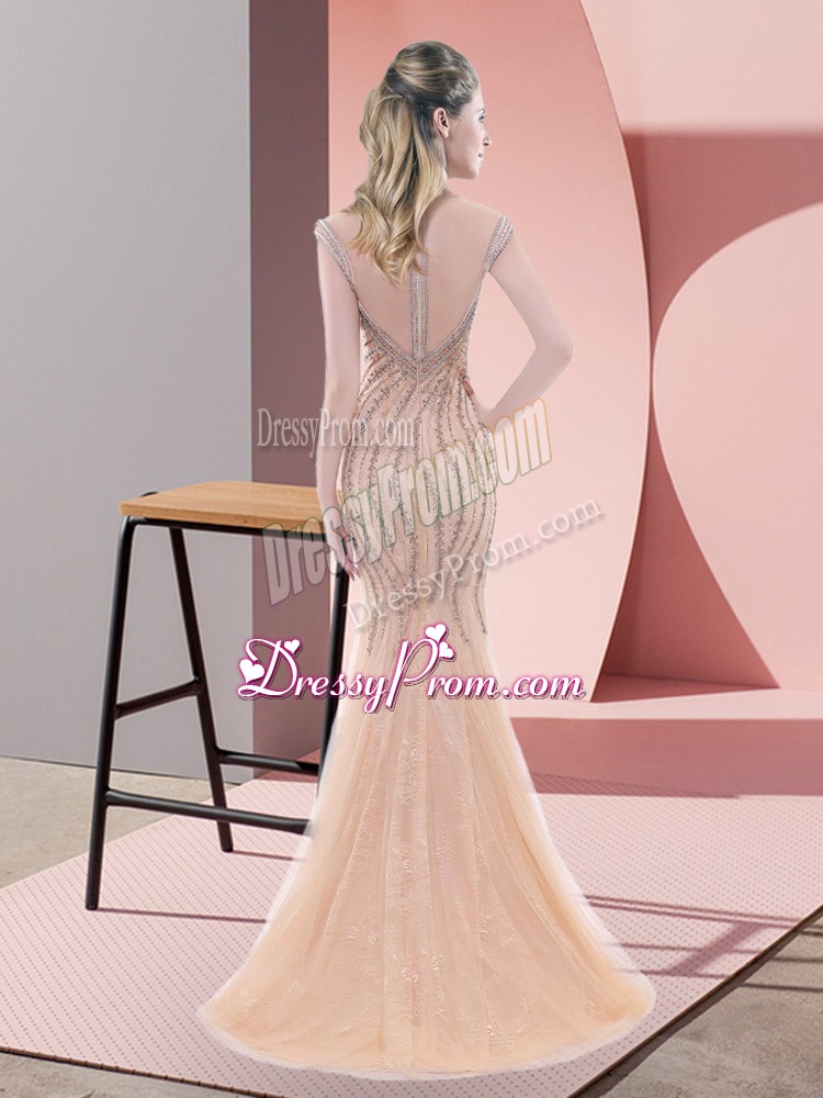 Neckline : ScoopShown Color : Baby BlueSilhouette : MermaidSleeve Length : cap sleevesBack Detail : ZipperFabric : TulleEmbellishment : BeadingOccasion : Prom,Party,Military BallSeason : Spring,Summer,Fall,Winter