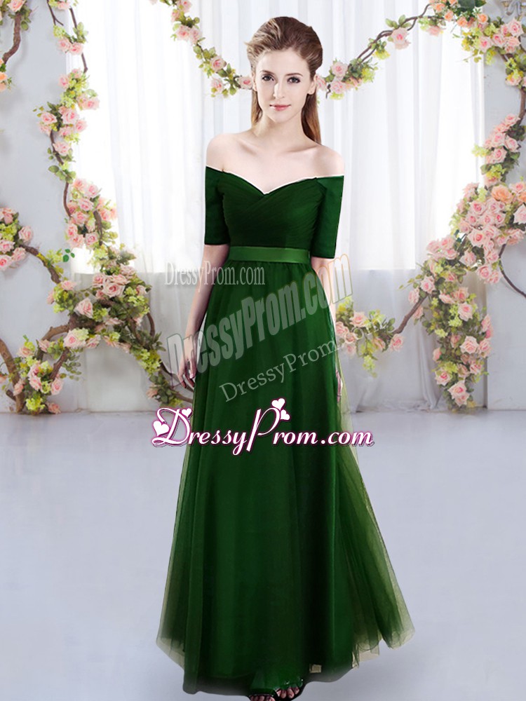 Neckline : Off the shoulder Shown Color : Green Silhouette : Empire Sleeve Length : short sleeves Hemline : floor length Back Detail : Lace up Fabric : Tulle Embellishment : Ruching Occasion : Prom,Party,Wedding Party Season : Spring,Summer,Fall,Winter