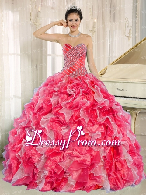 Neckline : SweetheartShown Color : White And Red Silhouette : Ball GownsSleeve Length : sleevelessHemline : floor lengthBack Detail : Lace upFabric : OrganzaEmbellishment : Beading,RufflesOccasion : Prom,Military Ball,Sweet 16,QuinceaneraSeason : Spring,Summer,Fall,Winter