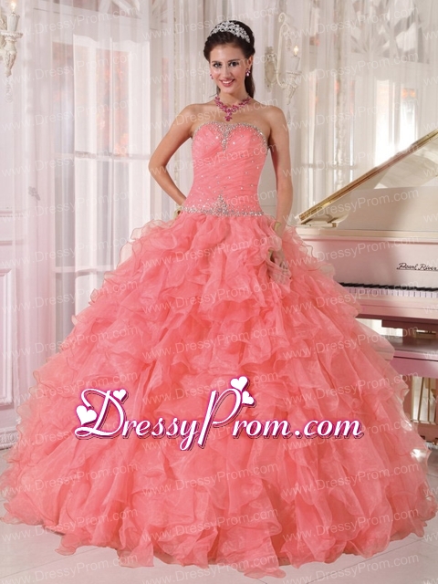 Neckline : StraplessShown Color : Watermelon RedSilhouette : Ball GownsSleeve Length : sleevelessHemline : floor lengthBack Detail : Lace upFabric : OrganzaEmbellishment : Beading,RufflesOccasion : Prom,Military Ball,Sweet 16,QuinceaneraSeason : Spring,Summer,Fall,Winter