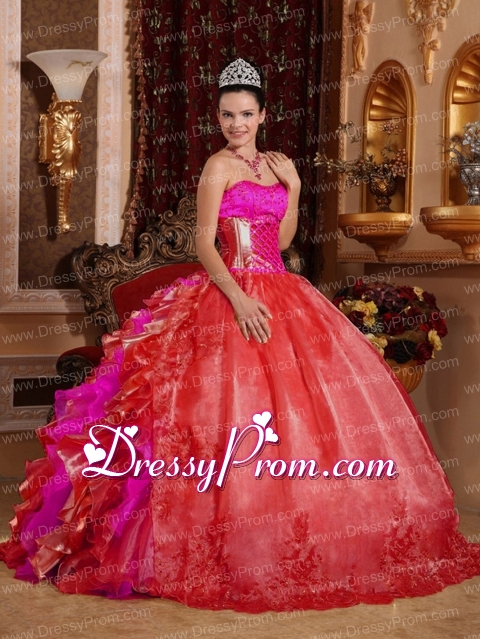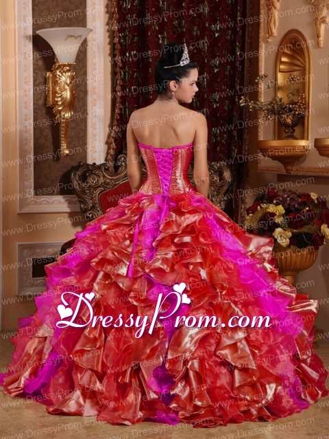 Neckline : StraplessShown Color : Multi-colorSilhouette : Ball GownsSleeve Length : sleevelessHemline : floor lengthBack Detail : Lace upFabric : OrganzaEmbellishment : Beading,RufflesOccasion : Prom,Military Ball,Sweet 16,QuinceaneraSeason : Spring,Summer,Fall,Winter