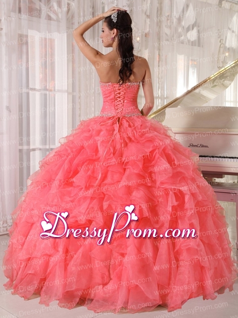 Neckline : StraplessShown Color : Watermelon RedSilhouette : Ball GownsSleeve Length : sleevelessHemline : floor lengthBack Detail : Lace upFabric : OrganzaEmbellishment : Beading,RufflesOccasion : Prom,Military Ball,Sweet 16,QuinceaneraSeason : Spring,Summer,Fall,Winter
