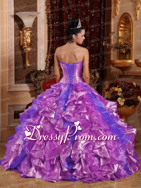Neckline : StraplessShown Color : Lilac,Multi-colorSilhouette : Ball GownsSleeve Length : sleevelessHemline : floor lengthBack Detail : Lace upFabric : OrganzaEmbellishment : Beading,Embroidery,RufflesOccasion : Prom,Military Ball,Sweet 16,QuinceaneraSeason : Spring,Summer,Fall,Winter