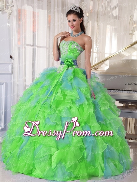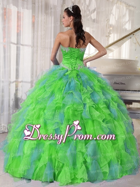 Neckline : SweetheartShown Color : Green,Spring GreenSilhouette : Ball GownsSleeve Length : sleevelessHemline : floor lengthBack Detail : Lace upFabric : OrganzaEmbellishment : Beading,RufflesOccasion : Prom,Military Ball,Sweet 16,QuinceaneraSeason : Spring,Summer,Fall,Winter