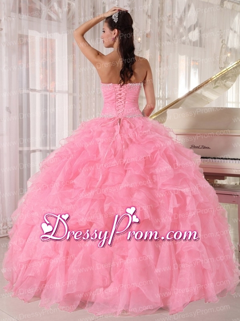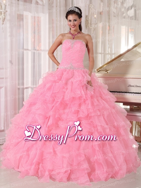 Neckline : StraplessShown Color : Pink ,Baby PinkSilhouette : Ball GownsSleeve Length : sleevelessHemline : floor lengthBack Detail : Lace upFabric : OrganzaEmbellishment : Beading,RufflesOccasion : Prom,Military Ball,Sweet 16,QuinceaneraSeason : Spring,Summer,Fall,Winter