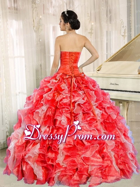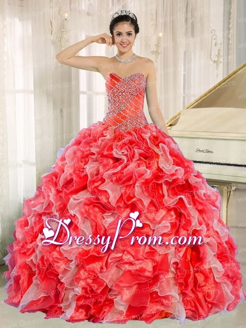 Neckline : SweetheartShown Color : White And Red Silhouette : Ball GownsSleeve Length : sleevelessHemline : floor lengthBack Detail : Lace upFabric : OrganzaEmbellishment : Beading,RufflesOccasion : Prom,Military Ball,Sweet 16,QuinceaneraSeason : Spring,Summer,Fall,Winter