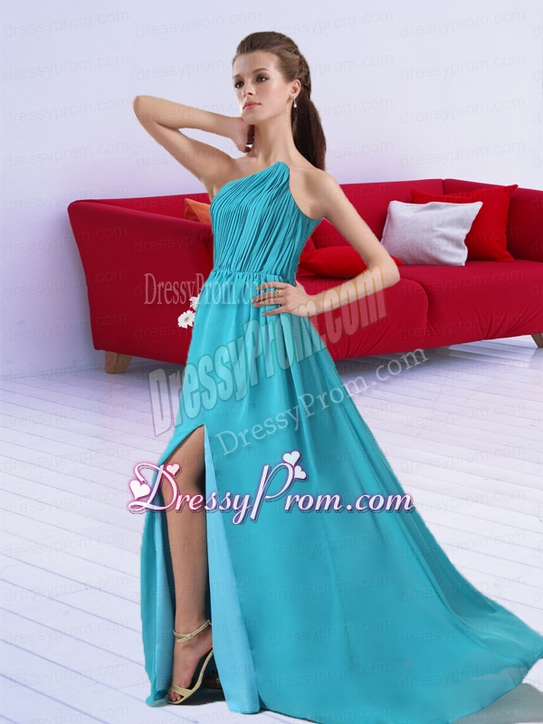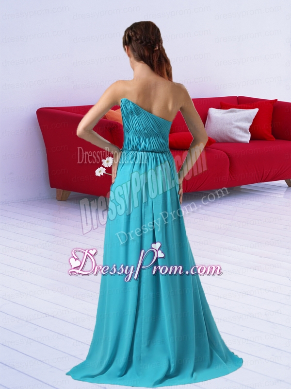 Neckline : StraplessShown Color : Aqua BlueSilhouette : EmpireSleeve Length : sleevelessHemline : with trainBack Detail : BacklessFabric : ChiffonEmbellishment : RuchingOccasion : Prom,Formal Evening,GraduationSeason : Spring,Summer,Fall