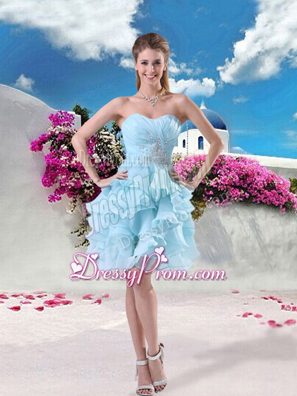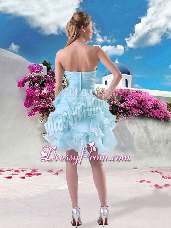 Neckline : SweetheartShown Color : Light BlueSilhouette : A-lineSleeve Length : sleevelessHemline : mini lengthBack Detail : ZipperFabric : OrganzaEmbellishment : Beading,Ruffles,RuchingOccasion : Prom,Party,Cocktail,Homecoming,Graduation,Holiday,Birthday PartySeason : Spring,Summer,Fall