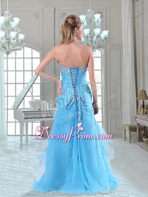 Neckline : SweetheartShown Color : Aqua BlueSilhouette : Column/SheathSleeve Length : sleevelessHemline : floor lengthBack Detail : Lace upFabric : OrganzaEmbellishment : Beading,Ruffles,RuchingOccasion : Prom,Military Ball,PageantSeason : Spring,Summer,Fall,Winter