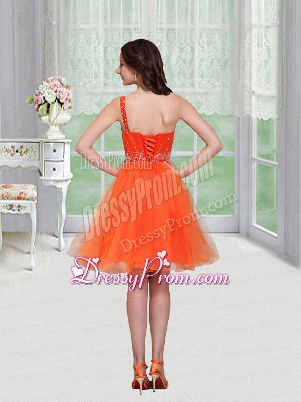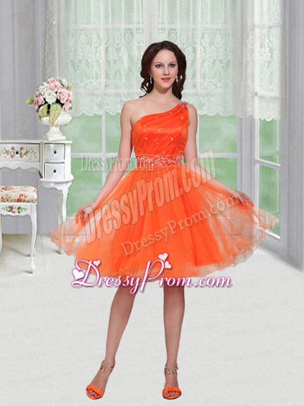 Neckline : One shoulderShown Color : OrangeSilhouette : A-lineSleeve Length : sleevelessHemline : knee lengthBack Detail : Lace upFabric : OrganzaEmbellishment : BeadingOccasion : Prom,Party,Cocktail,Homecoming,Graduation,Holiday,Birthday PartySeason : Spring,Summer,Fall