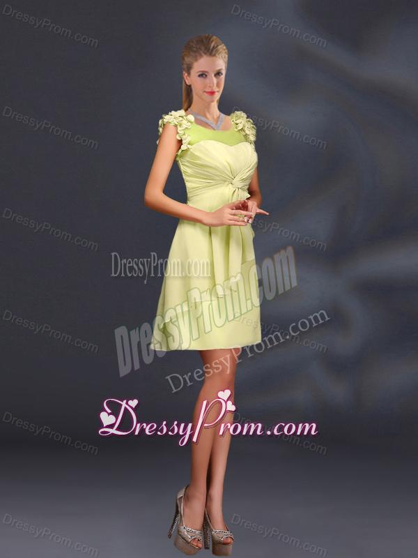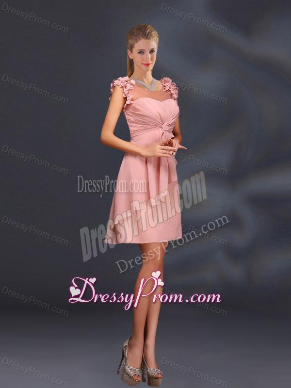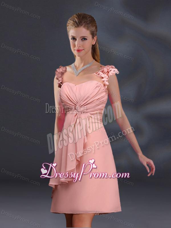 Neckline : One shoulderShown Color : Pink Silhouette : A-lineSleeve Length : sleevelessHemline : mini lengthBack Detail : ZipperFabric : ChiffonEmbellishment : Appliques,Ruching,Hand Made FlowerOccasion : Prom,Party,Cocktail,Homecoming,Sweet 16,QuinceaneraSeason : Spring,Summer,Fall