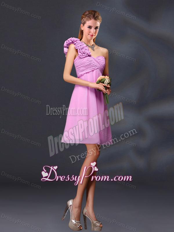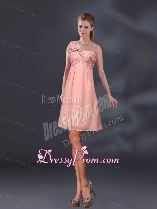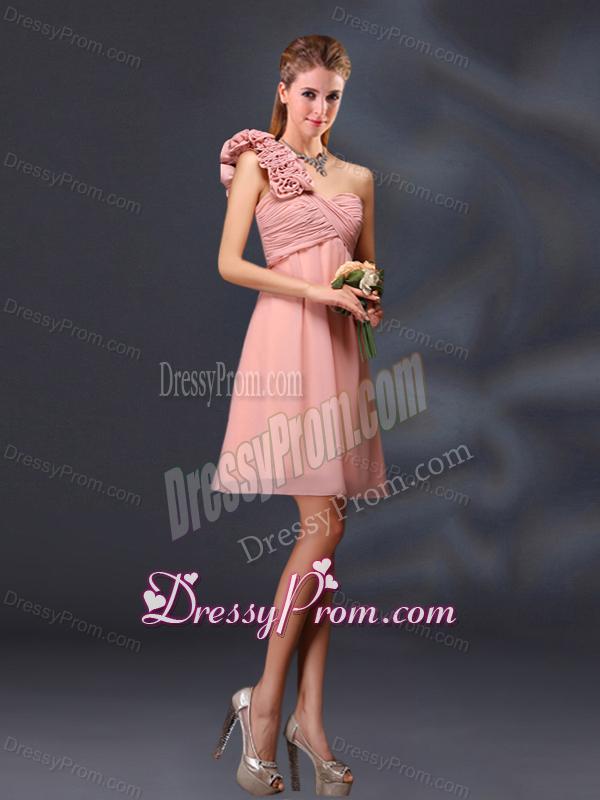 Neckline : BateauShown Color : Pink Silhouette : A-lineSleeve Length : sleevelessHemline : mini lengthBack Detail : ZipperFabric : ChiffonEmbellishment : Ruching,Hand Made FlowerOccasion : Prom,Party,Cocktail,Homecoming,Graduation,Sweet 16,QuinceaneraSeason : Spring,Summer,Fall