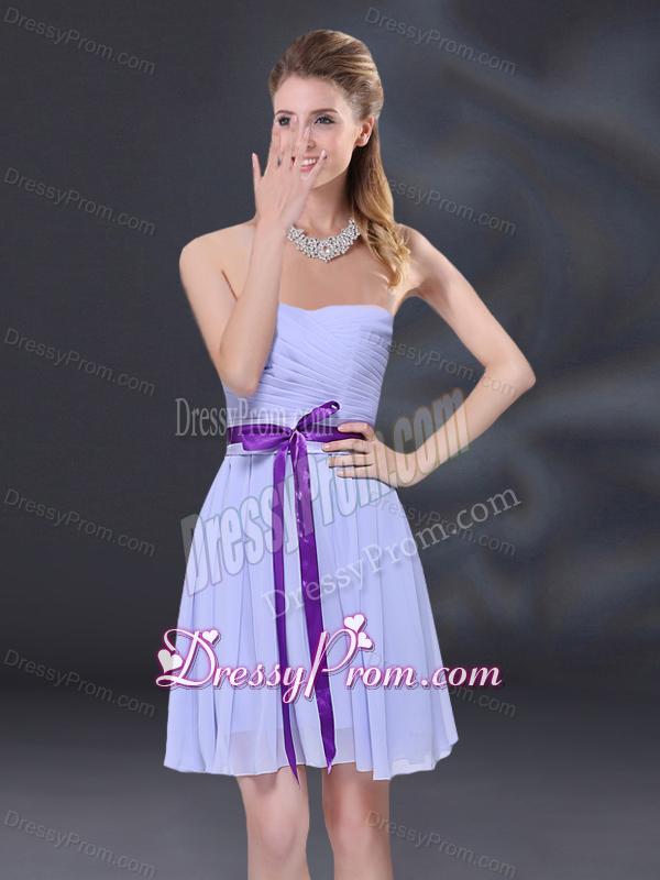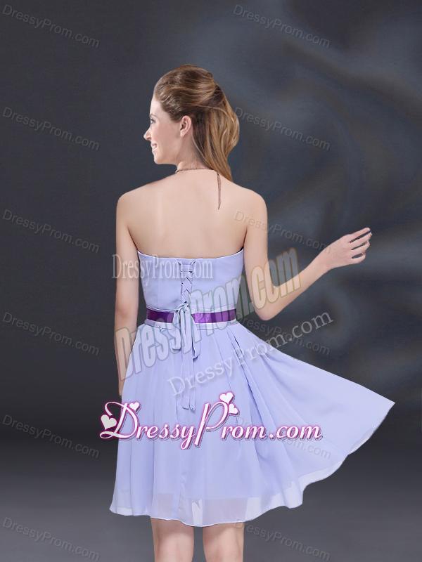 Neckline : One shoulderShown Color : LavenderSilhouette : A-lineSleeve Length : sleevelessHemline : mini lengthBack Detail : Lace upFabric : ChiffonEmbellishment : Ruching,BeltOccasion : Prom,Party,Cocktail,Homecoming,Graduation,Sweet 16,QuinceaneraSeason : Spring,Summer,Fall