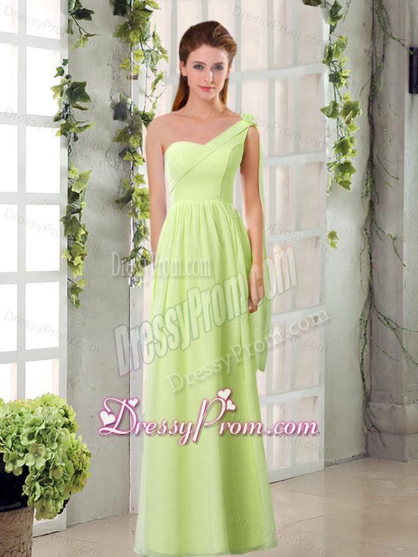 Neckline : One shoulderShown Color : ChampagneSilhouette : EmpireSleeve Length : sleevelessHemline : floor lengthBack Detail : ZipperFabric : ChiffonEmbellishment : RuchingOccasion : Prom,Sweet 16,QuinceaneraSeason : Spring,Summer,Fall,Winter
