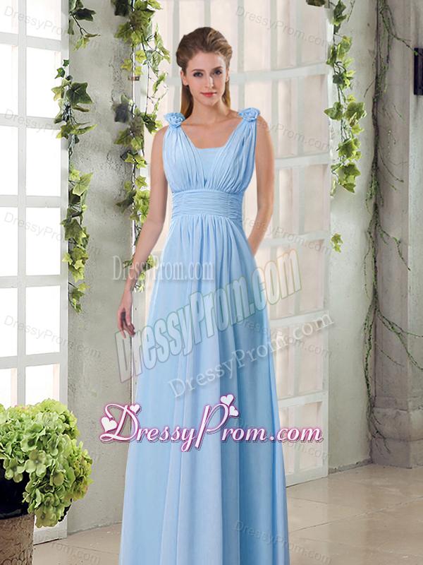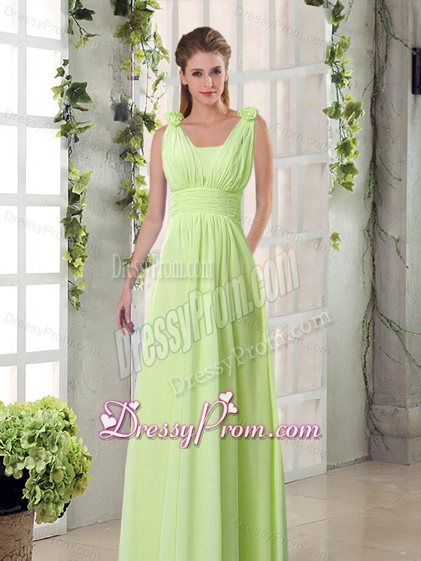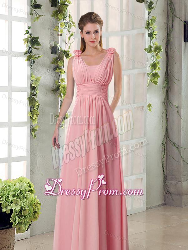 Neckline : StrapsShown Color : ChampagneSilhouette : EmpireSleeve Length : sleevelessHemline : floor lengthBack Detail : ZipperFabric : ChiffonEmbellishment : Ruching,Hand Made FlowerOccasion : Prom,Sweet 16,QuinceaneraSeason : Spring,Summer,Fall,Winter
