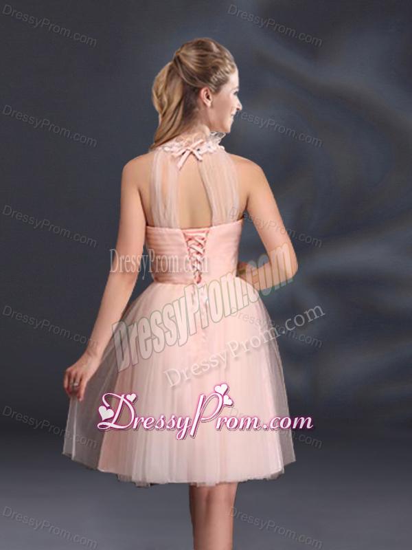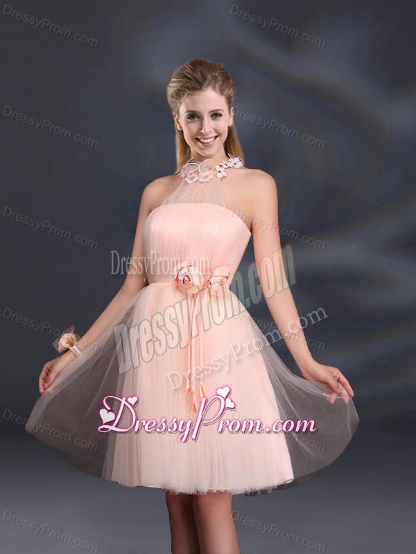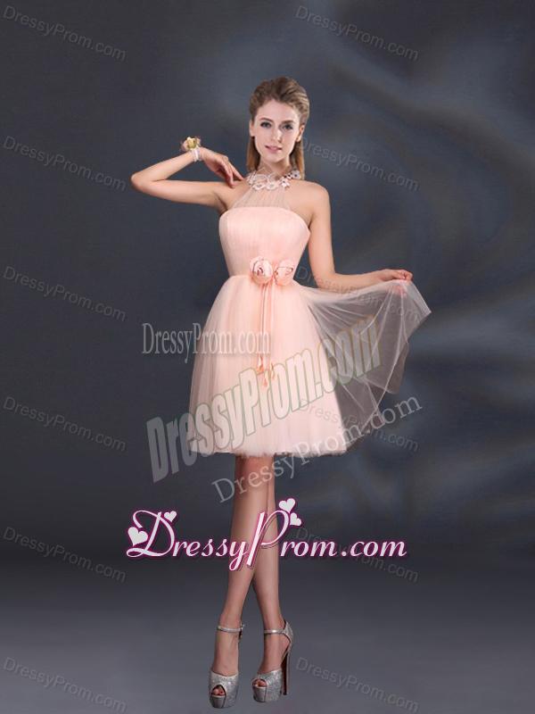 Neckline : Halter top Shown Color : Baby Pink Silhouette : A-line Sleeve Length : sleeveless Hemline : mini length Back Detail : Lace up Fabric : Tulle Embellishment : Hand Made Flower Occasion : Prom,Party,Cocktail,Homecoming,Graduation,Sweet 16,Quinceanera Season : Spring,Summer,Fall