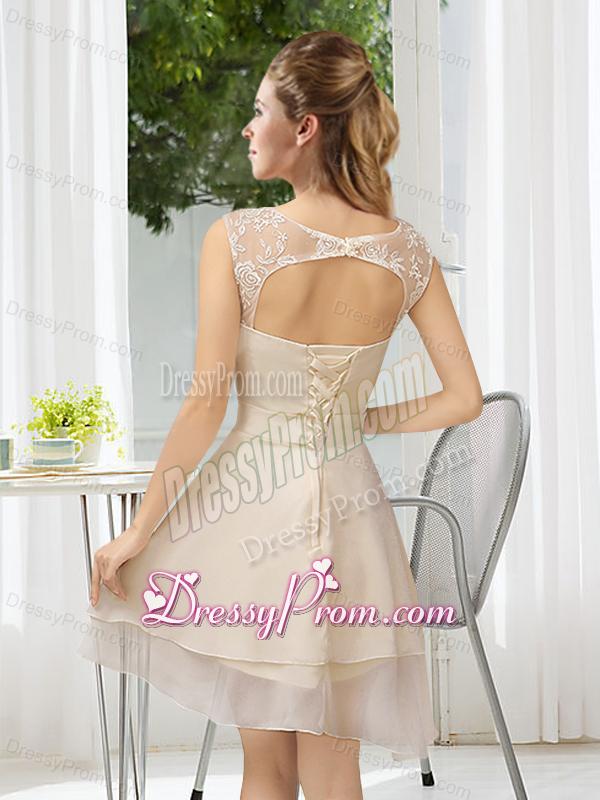 Neckline : BateauShown Color : ChampagneSilhouette : A-lineSleeve Length : sleevelessHemline : mini lengthBack Detail : Lace upFabric : ChiffonEmbellishment : BeltOccasion : Prom,Party,Cocktail,Homecoming,Graduation,Sweet 16,QuinceaneraSeason : Spring,Summer,Fall