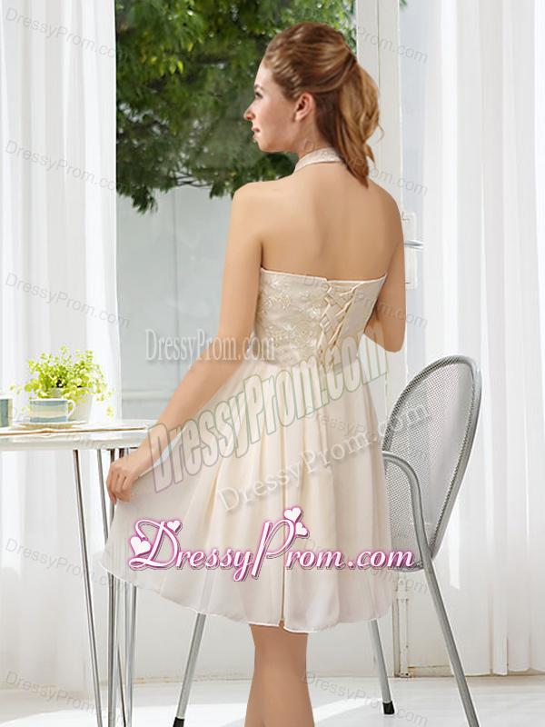 Neckline : BateauShown Color : ChampagneSilhouette : A-lineSleeve Length : sleevelessHemline : mini lengthBack Detail : Lace upFabric : ChiffonEmbellishment : AppliquesOccasion : Prom,Party,Cocktail,Homecoming,Graduation,Sweet 16,QuinceaneraSeason : Spring,Summer,Fall