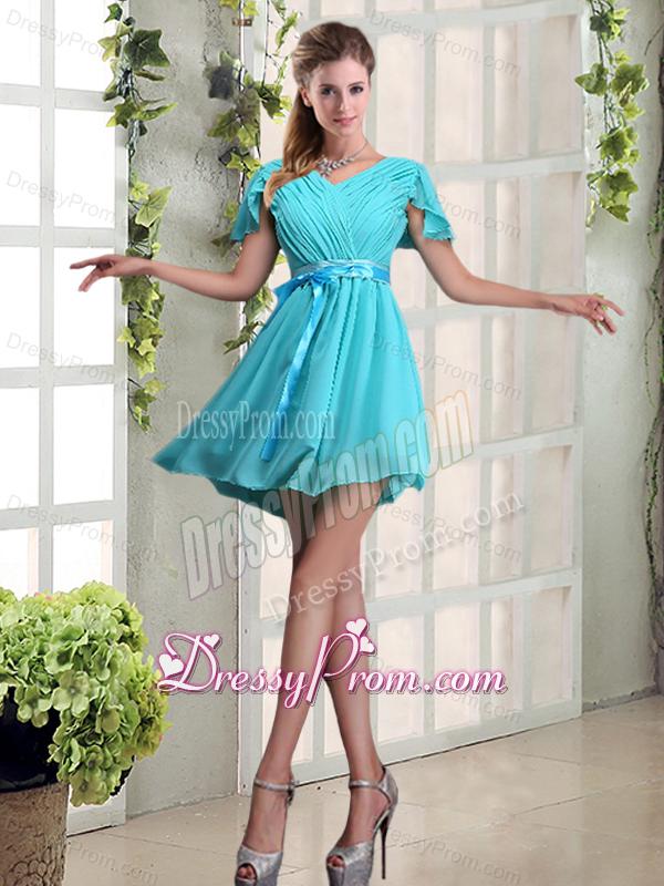 Neckline : V-neck Shown Color : Aqua Blue Silhouette : A-line Sleeve Length : cap sleeves Hemline : mini length Back Detail : Lace up Fabric : Chiffon Embellishment : Ruching,Belt Occasion : Prom,Party,Cocktail,Homecoming,Graduation,Sweet 16,Quinceanera Season : Spring,Summer,Fall