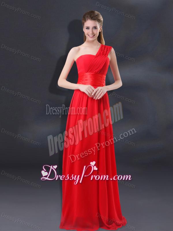 Neckline : One shoulderShown Color : RedSilhouette : EmpireSleeve Length : sleevelessHemline : floor lengthBack Detail : ZipperFabric : ChiffonEmbellishment : RuchingOccasion : Prom,Sweet 16,QuinceaneraSeason : Spring,Summer,Fall,Winter