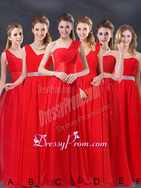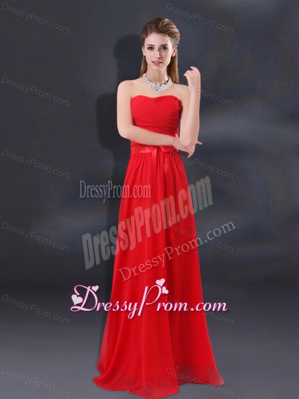 Neckline : StraplessShown Color : RedSilhouette : EmpireSleeve Length : sleevelessHemline : floor lengthBack Detail : ZipperFabric : ChiffonEmbellishment : Ruching,BeltOccasion : Prom,Sweet 16,QuinceaneraSeason : Spring,Summer,Fall,Winter
