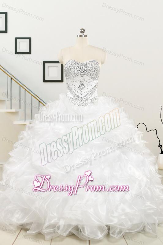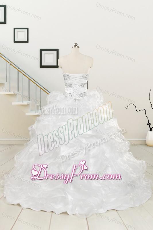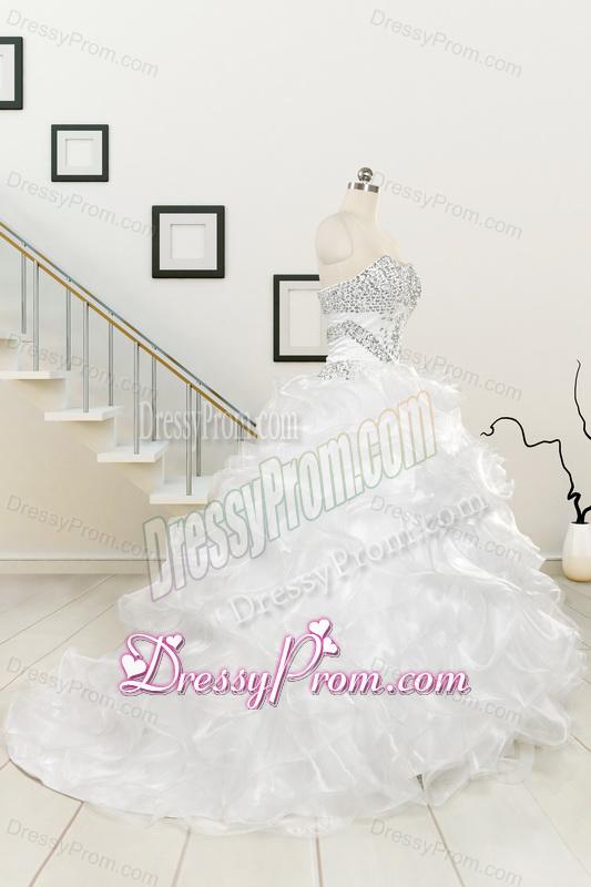 Neckline : SweetheartShown Color : WhiteSilhouette : Ball GownsSleeve Length : sleevelessHemline : with trainBack Detail : Lace upFabric : OrganzaEmbellishment : Beading,RufflesOccasion : Military Ball,Sweet 16,QuinceaneraSeason : Spring,Summer,Fall,Winter