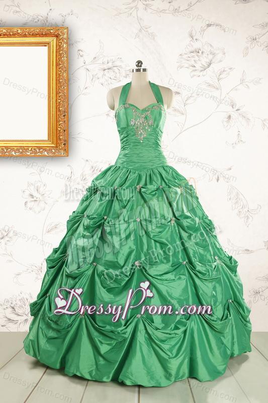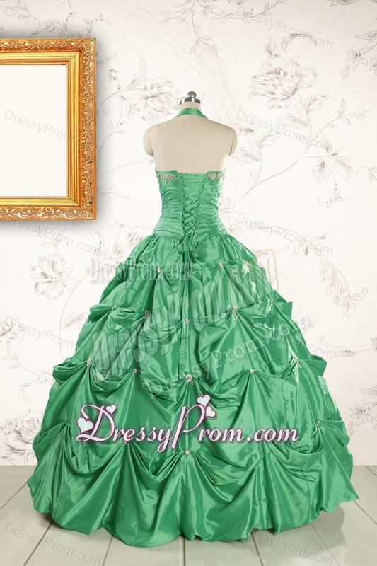 Neckline : Halter topShown Color : GreenSilhouette : Ball GownsSleeve Length : sleevelessHemline : floor lengthBack Detail : Lace upFabric : TaffetaEmbellishment : Appliques,Pick UpsOccasion : Military Ball,Sweet 16,QuinceaneraSeason : Spring,Summer,Fall,Winter
