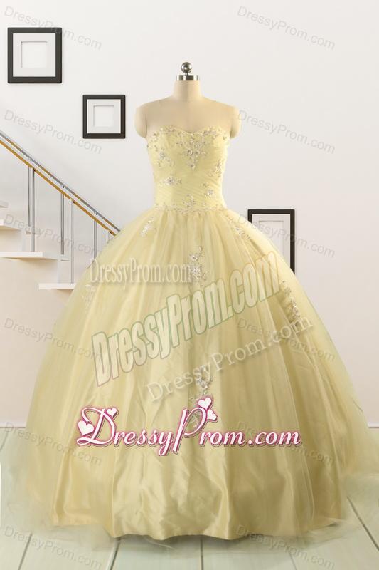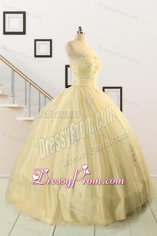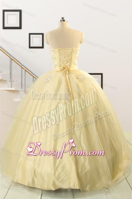 Neckline : SweetheartShown Color : Light YellowSilhouette : Ball GownsSleeve Length : sleevelessHemline : floor lengthBack Detail : Lace upFabric : Taffeta,TulleEmbellishment : AppliquesOccasion : Military Ball,Sweet 16,QuinceaneraSeason : Spring,Summer,Fall,Winter