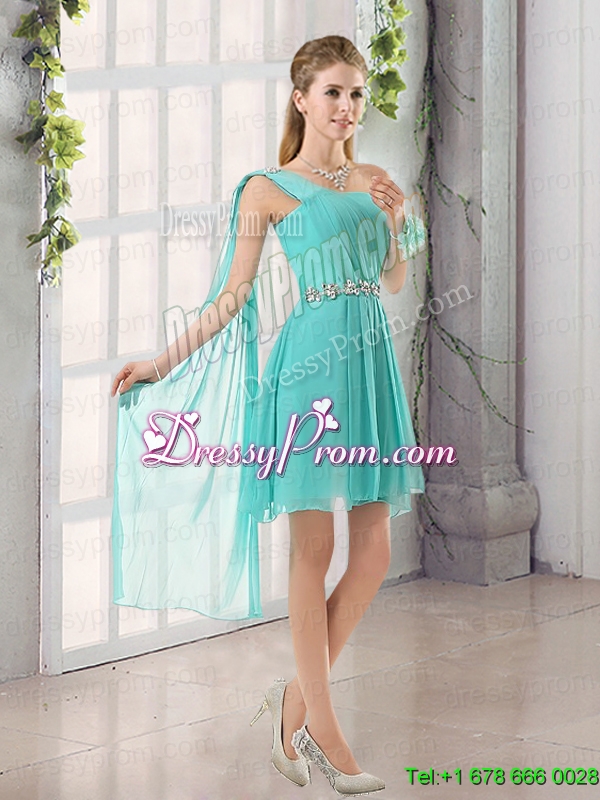 Neckline : One shoulder Shown Color : Aqua Blue Silhouette : A-line Sleeve Length : sleeveless Hemline : mini length Back Detail : Lace up Fabric : Chiffon Embellishment : Beading,Sequins,Ruching,Belt Occasion : Prom,Party,Homecoming,Wedding Party Season : Spring,Summer,Fall,Winter