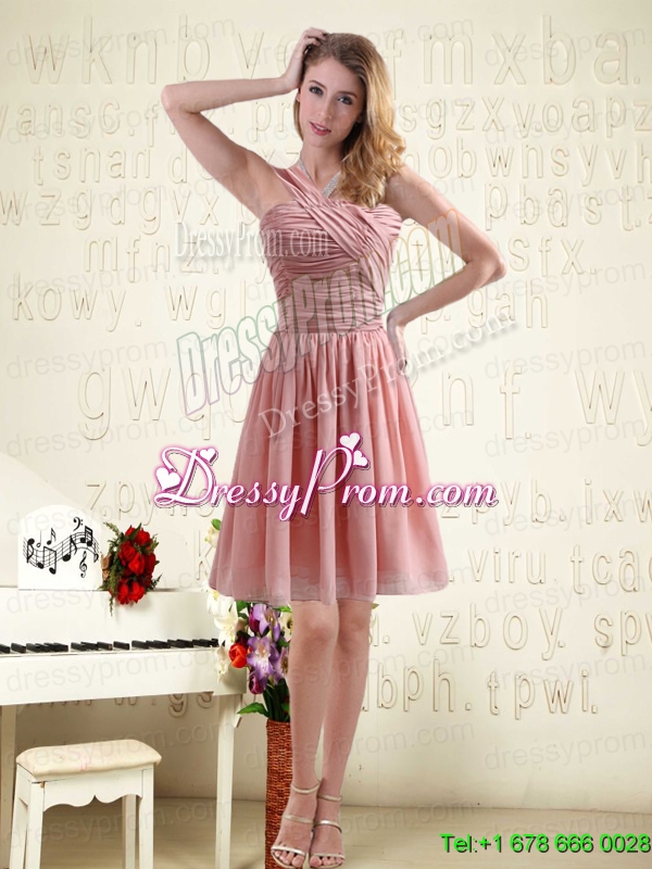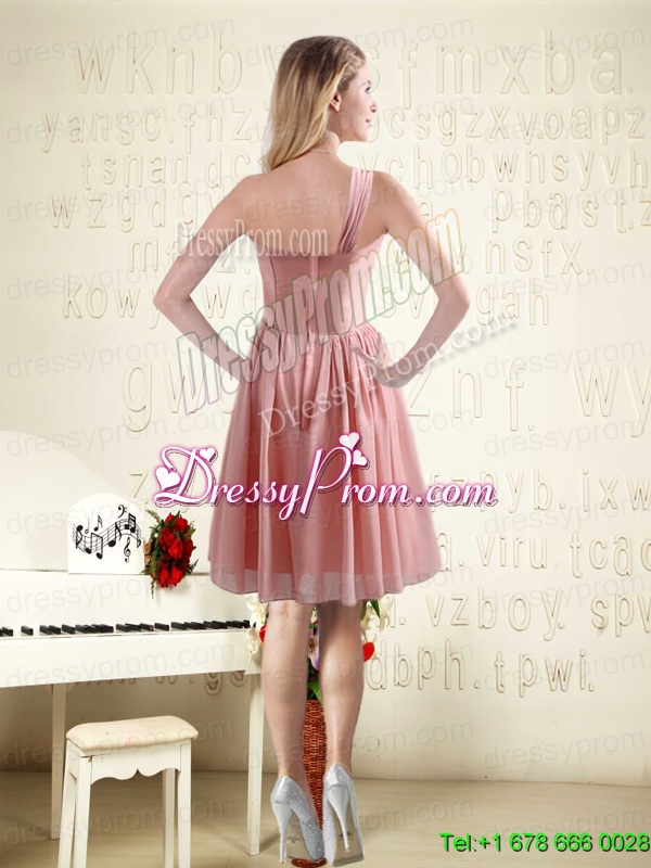 Neckline : One shoulderShown Color : Pink Silhouette : EmpireSleeve Length : sleevelessHemline : mini lengthBack Detail : ZipperFabric : ChiffonEmbellishment : RuchingOccasion : Prom,Party,Homecoming,Wedding PartySeason : Spring,Summer,Fall,Winter