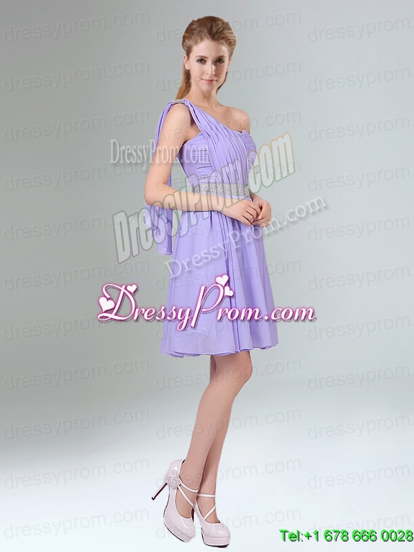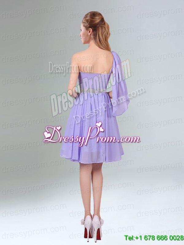 Neckline : One shoulderShown Color : LavenderSilhouette : ShortSleeve Length : sleevelessHemline : mini lengthBack Detail : ZipperFabric : ChiffonEmbellishment : Beading,RuchingOccasion : Prom,Party,Homecoming,Wedding PartySeason : Spring,Summer,Fall,Winter