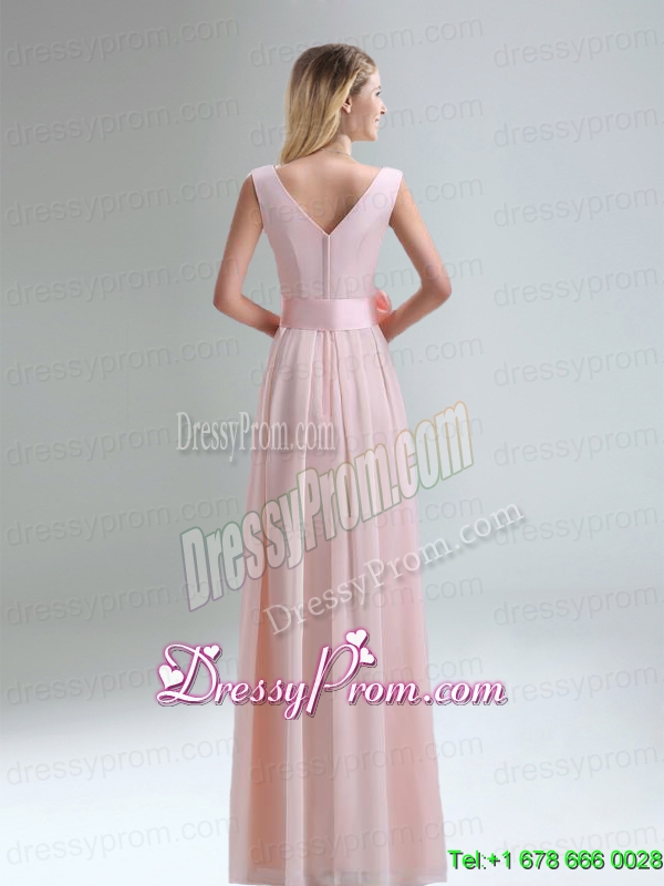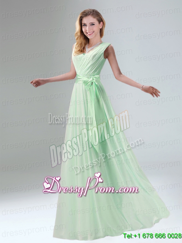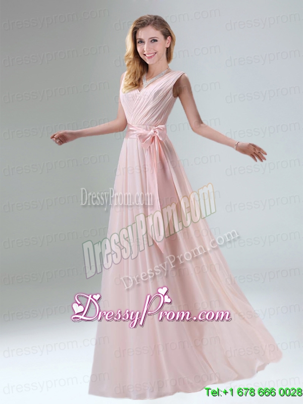 Neckline : V-neckShown Color : Baby PinkSilhouette : EmpireSleeve Length : sleevelessHemline : floor lengthBack Detail : ZipperFabric : ChiffonEmbellishment : Ruching,BowknotOccasion : Prom,Party,Homecoming,Wedding PartySeason : Spring,Summer,Fall,Winter