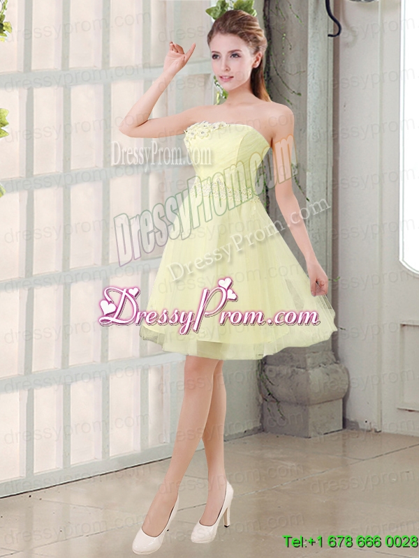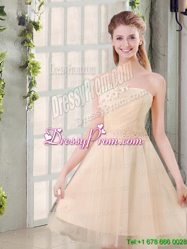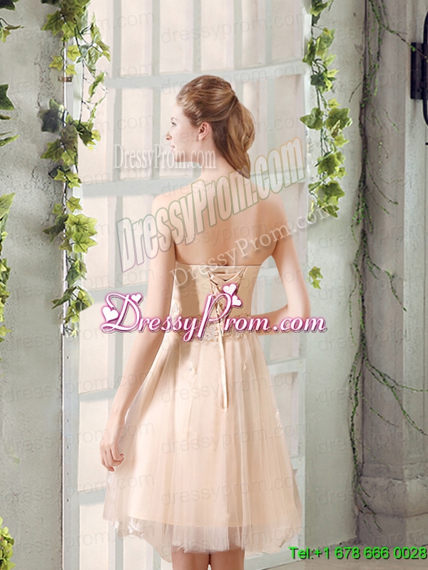 Neckline : StraplessShown Color : ChampagneSilhouette : A-lineSleeve Length : sleevelessHemline : mini lengthBack Detail : Lace upFabric : Chiffon,TulleEmbellishment : AppliquesOccasion : Prom,Party,Homecoming,Wedding PartySeason : Spring,Summer,Fall,Winter