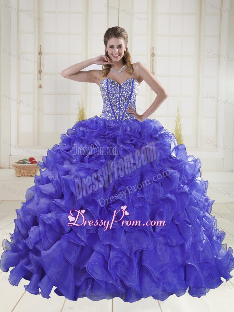 Neckline : SweetheartShown Color : Royal BlueSilhouette : Ball GownsSleeve Length : sleevelessHemline : floor lengthBack Detail : Lace upFabric : OrganzaEmbellishment : Beading,RufflesOccasion : Prom,Formal Evening,Graduation,Military Ball,Sweet 16,QuinceaneraSeason : Spring,Summer,Fall,Winter
