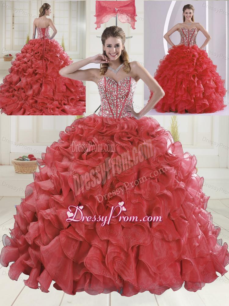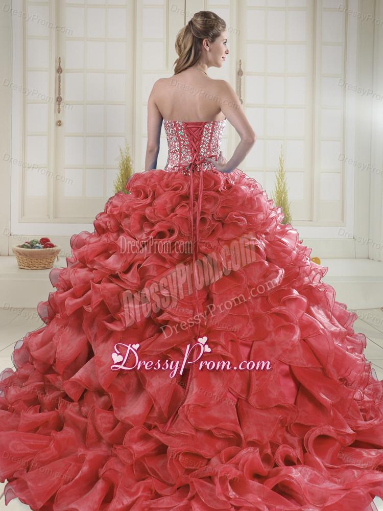Neckline : SweetheartShown Color : Coral RedSilhouette : Ball GownsSleeve Length : sleevelessHemline : floor lengthBack Detail : Lace upFabric : OrganzaEmbellishment : Beading,RufflesOccasion : Prom,Formal Evening,Graduation,Military Ball,Sweet 16,QuinceaneraSeason : Spring,Summer,Fall,Winter