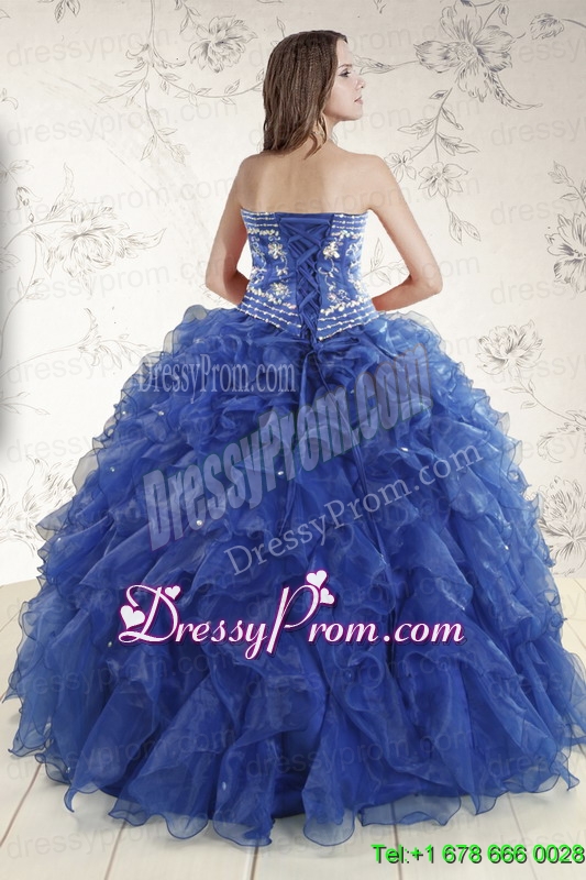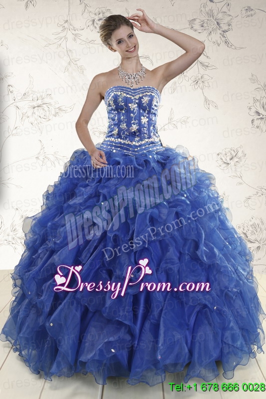 Neckline : StraplessShown Color : Royal BlueSilhouette : Ball GownsSleeve Length : sleevelessHemline : floor lengthBack Detail : Lace upFabric : OrganzaEmbellishment : Beading,RufflesOccasion : Military Ball,Sweet 16,QuinceaneraSeason : Spring,Summer,Fall,Winter